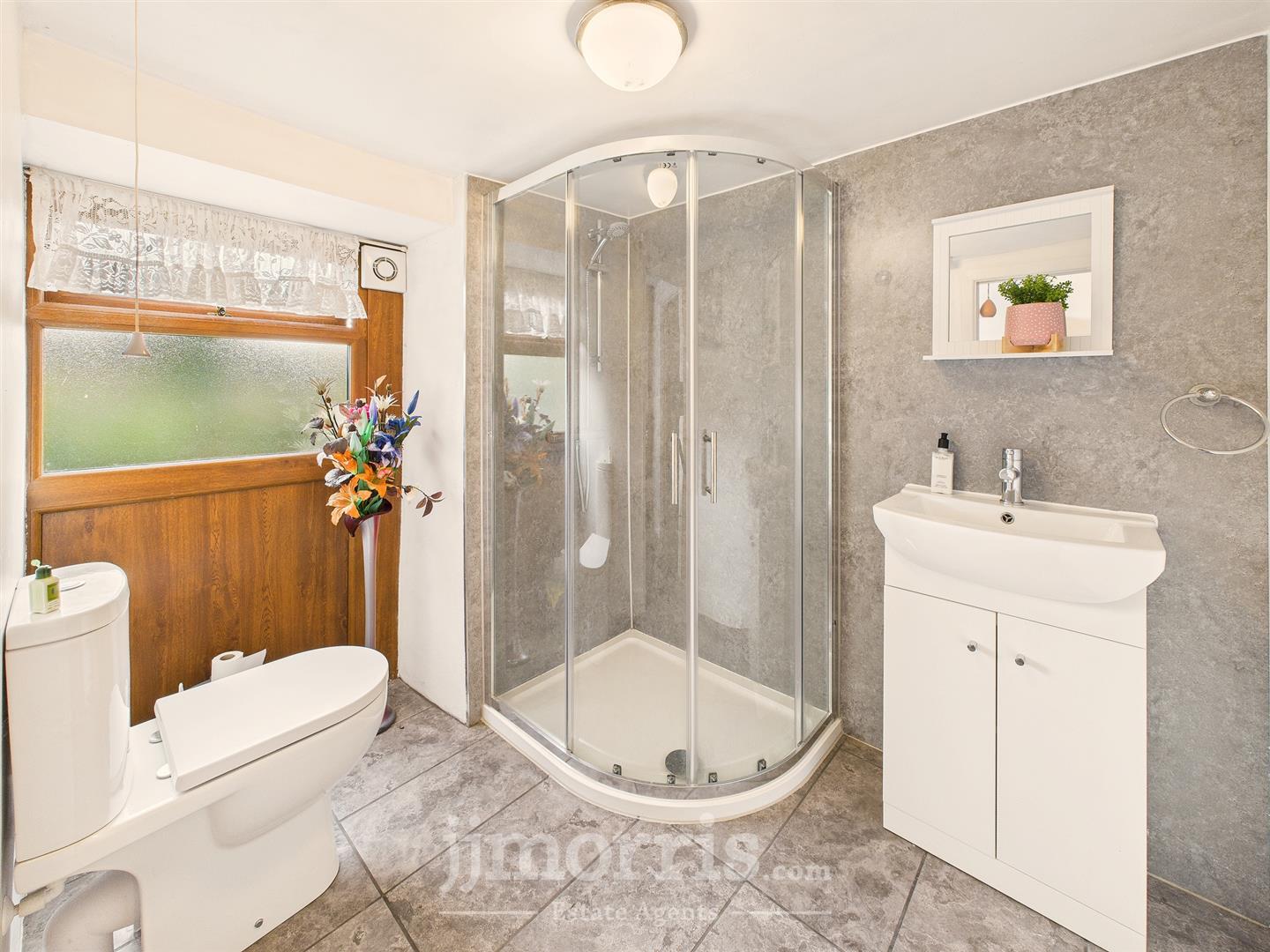 Shower Room - Low flush WC, vanity unit with hand wash basin, walk-in shower with fitted shower, extractor fan, part Aqua panel walls, tiled flooring.