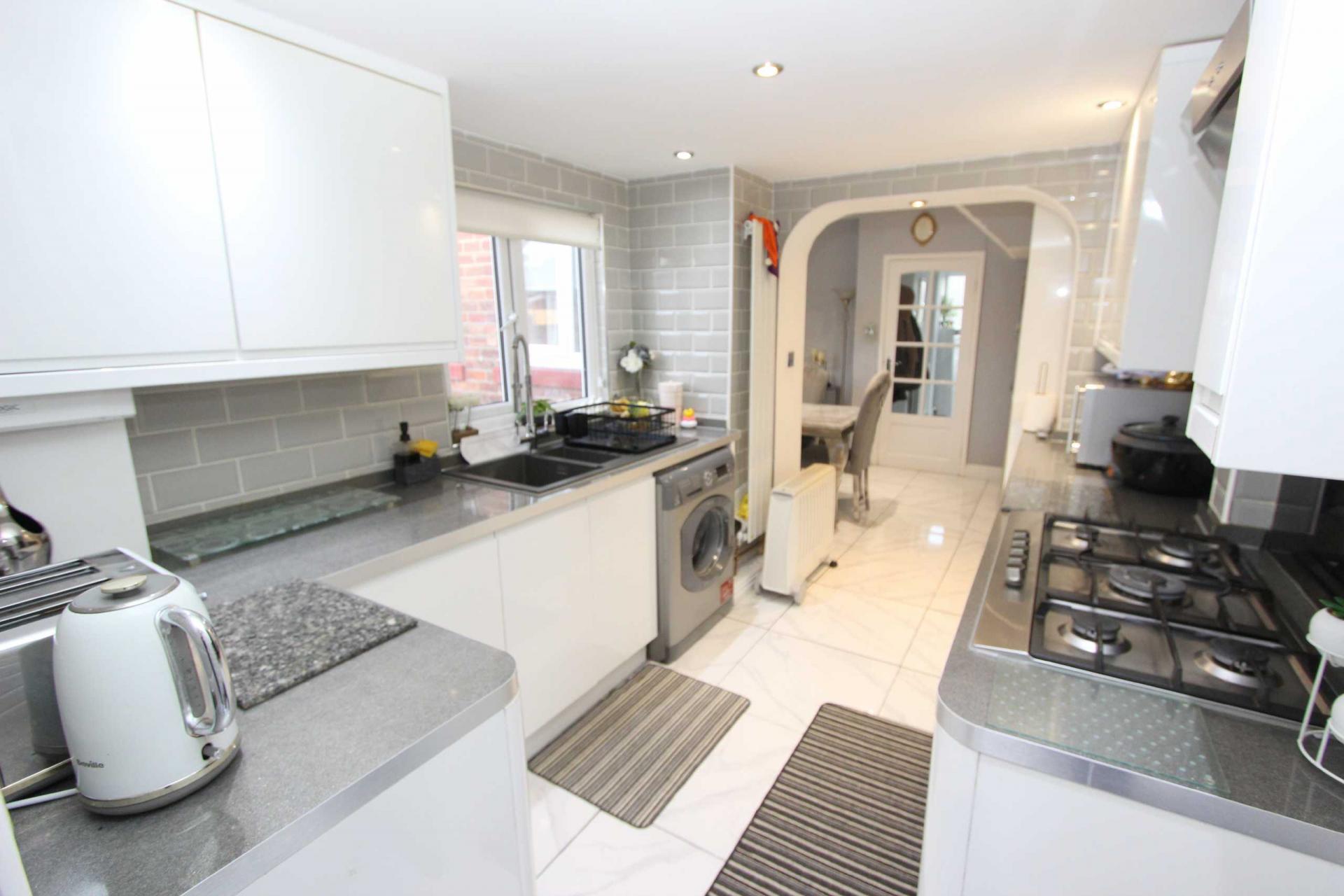 EXTENDED KITCHEN / DINER 12'10" max x 18'6" (3.9m max x 5.64m). A recently refitted kitchen with a range of wall and base units. Integrated oven, gas hob and extractor hood. Space and plumbing for a washing machine. Sink unit, space for a table and chairs, double glazed windows to the side and rear, upvc door to the rear. Tiled floor and tiled wall. Door to the ground floor cloakroom/WC.