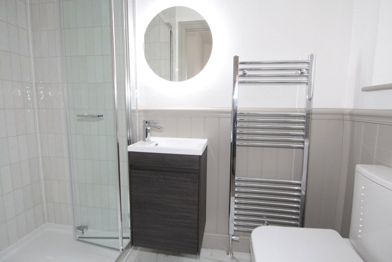 En Suite Shower Room/WC Comprising low level WC, wash hand basin in vanity unit, walk-in shower, half height panelling to walls, double glazed window, lit vanity mirror, tiled shower and tiled floor, extractor and chrome heated towel rail.