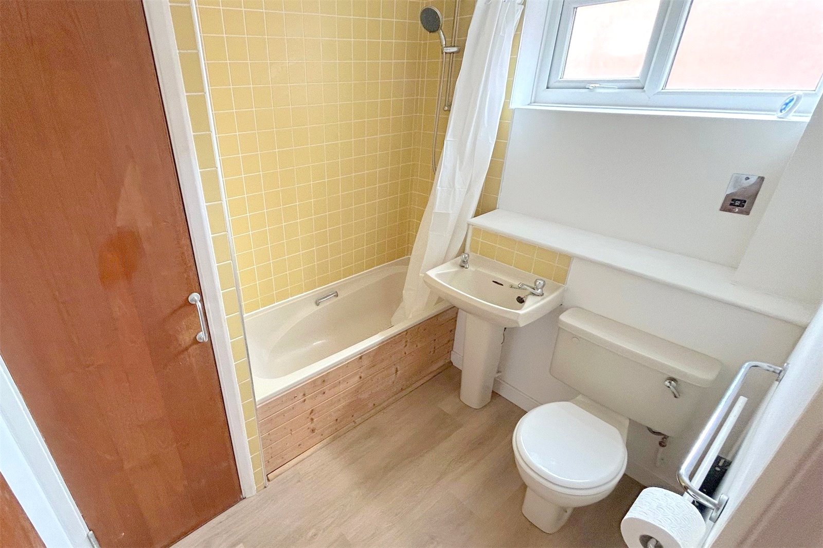 Bathroom/WC 7'10" x 6'5" (2.4m x 1.96m). Fitted with a white suite comprising; panelled bath with shower above, low level WC and wash basin. Radiator. Built in cupboard. Double glazed frosted window to the rear.