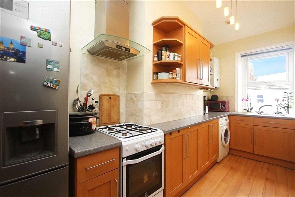 Kitchen 14'4" x 5'8" (4.37m x 1.73m). Fitted with a range of wall and base units, sink unit, gas cooker point with extractor hood above, space and plumbing for a washing machine, space for a fridge/freezer, double glazed window to the rear, part tiled walls.