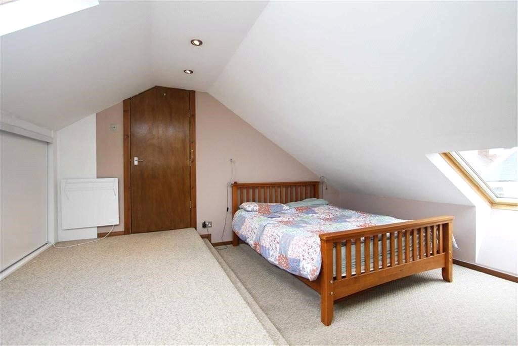 Main Bedroom Double glazed Velux windows to the front and rear, great fitted storage to the eaves with shelves and rails.