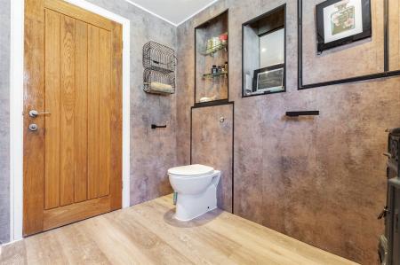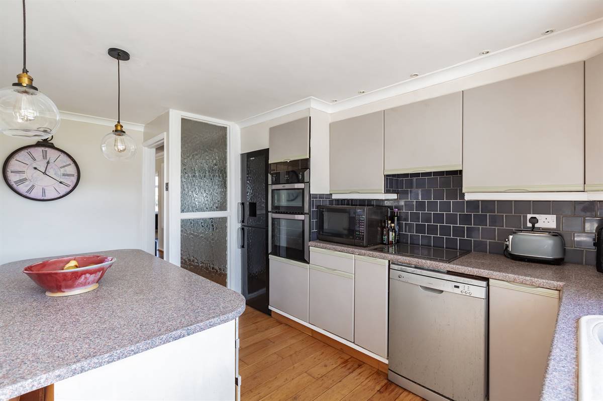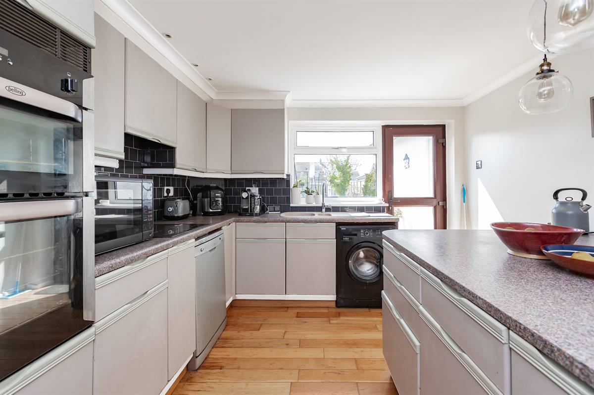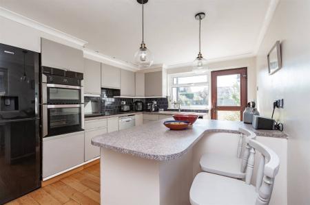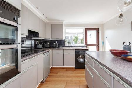 The Kitchen is planned with a matching range of wall and base units arranged on three walls. Inset 1.5 bowl sink unit. Partially tiled walls. Inset gas hob with extractor cooker hood above and built-in fan assisted electric double oven. Plumbing for washing machine and dishwasher. Window to side and rear. Radiator. Wood flooring. Door providing access to rear garden.
