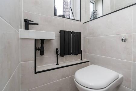Suite in white comprising wall hung wash hand basin and WC with concealed cistern. Tiled walls. Radiator. Frosted window to front. Tiled flooring.