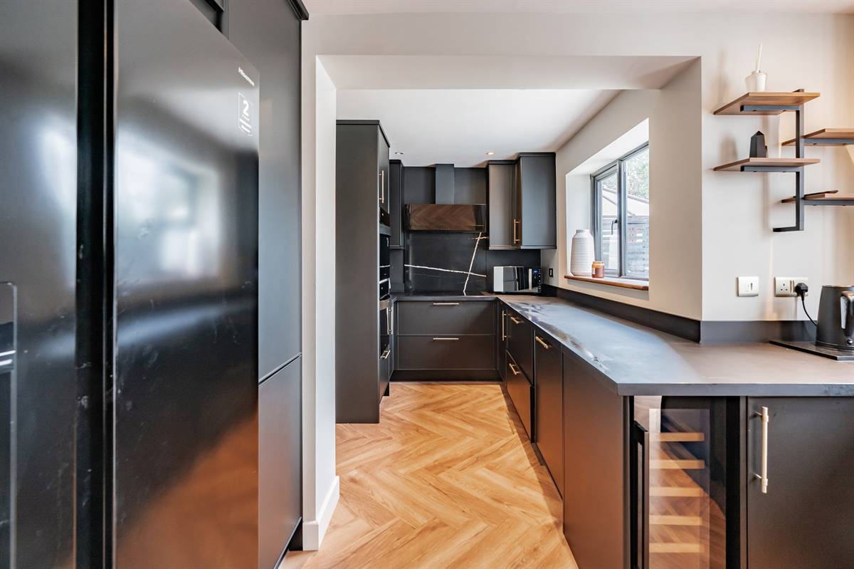 The kitchen is planned with a matching range of wall and base units arranged on four walls. Inset enamel sink unit. Inset induction hob with extractor cooker hood above and built-in fan assisted electric oven. Integrated dishwasher. Window to rear. Laminate flooring.