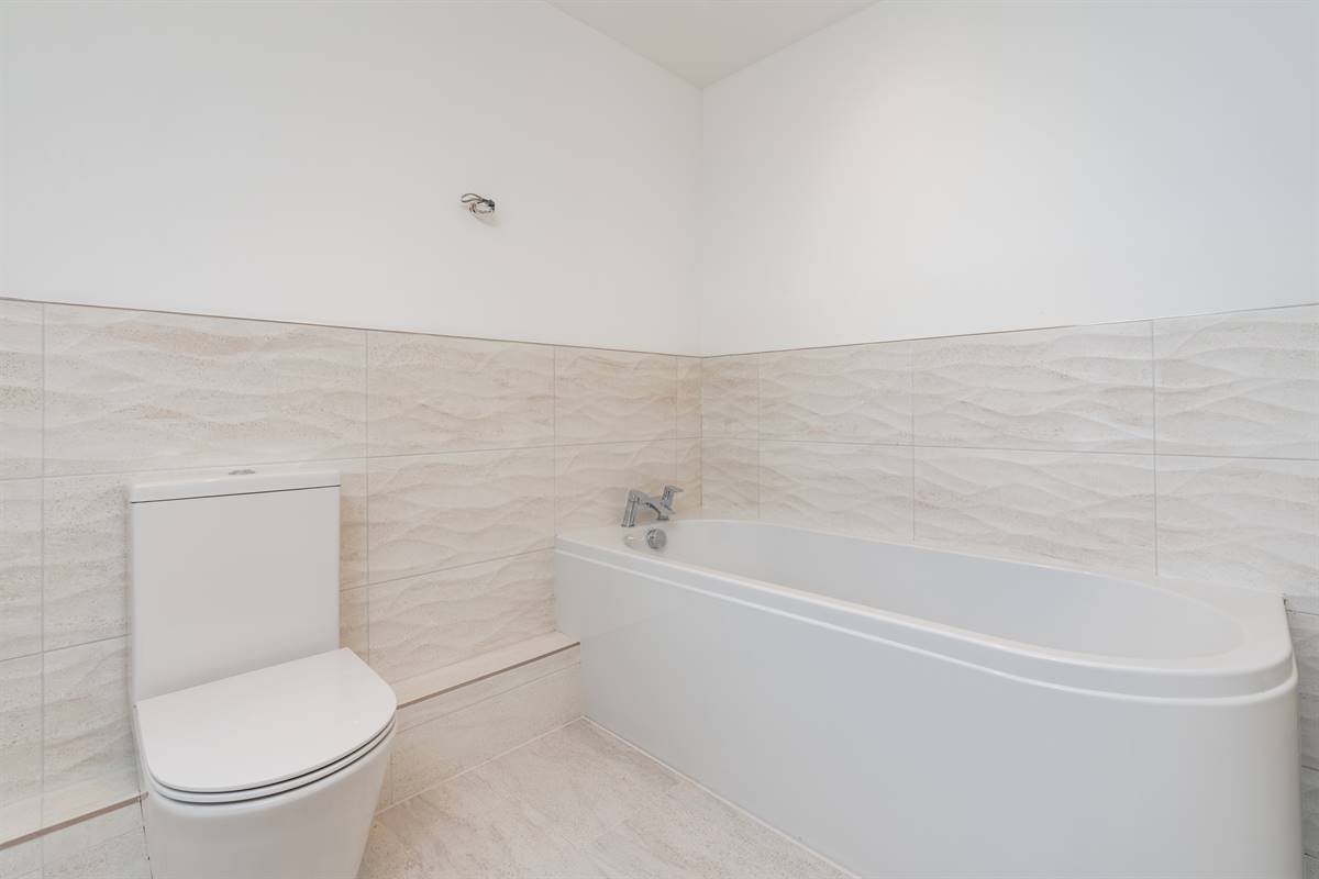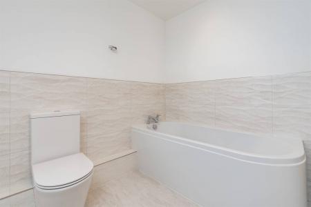 Suite in white comprising panelled bath with mixer tap, wall hung wash hand basin set into vanity unit with drawers below and close coupled WC. Chrome heated towel rail. Partially tiled walls. Frosted window to front. Tiled flooring. Extractor fan.