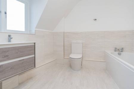 Suite in white comprising wash hand basin set into vanity unit and close coupled WC. Underfloor heating. Frosted window to front. Tiled flooring.