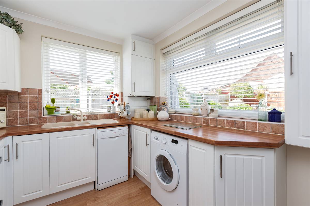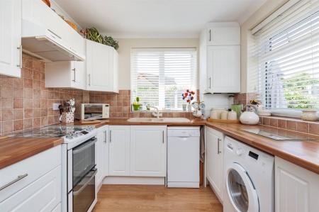 The kitchen is planned with a matching range of wall and base units arranged on four walls. Inset 1.5 bowl sink unit. Partially tiled walls. Gas cooker point and extractor cooker hood above. Plumbing for washing machine and dishwasher. Wall mounted combination gas boiler supplying hot water and central heating. Window to side and rear. Radiator. Laminate flooring.