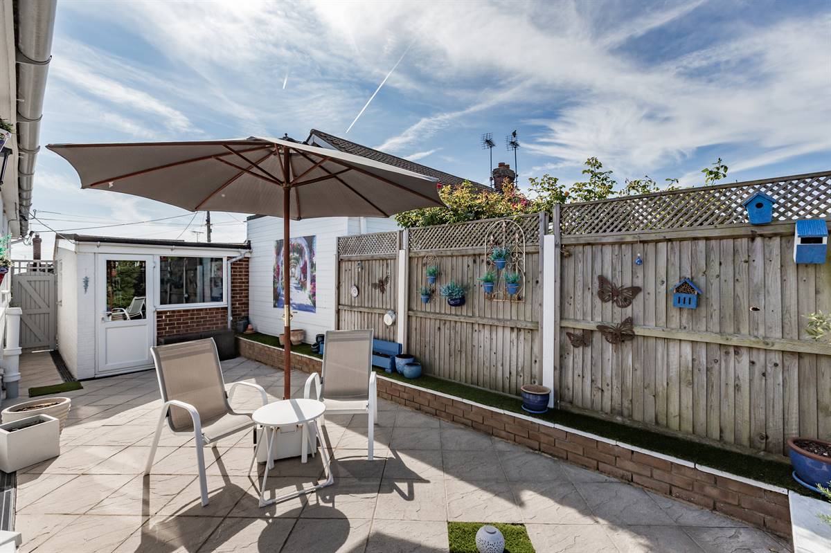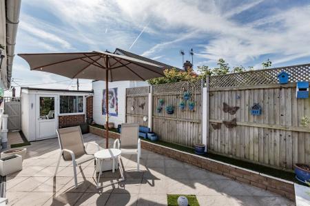 Mainly laid to paving with flower beds, bushes and shrubs. Paved patio area. Seating area. Gated pedestrian side access. Enclosed with fencing.