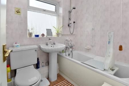 Suite in white comprising panelled bath with mixer tap and hand held shower attachment, pedestal wash hand basin and close coupled WC. Radiator. Tiled walls. Frosted window to side. Lino flooring.