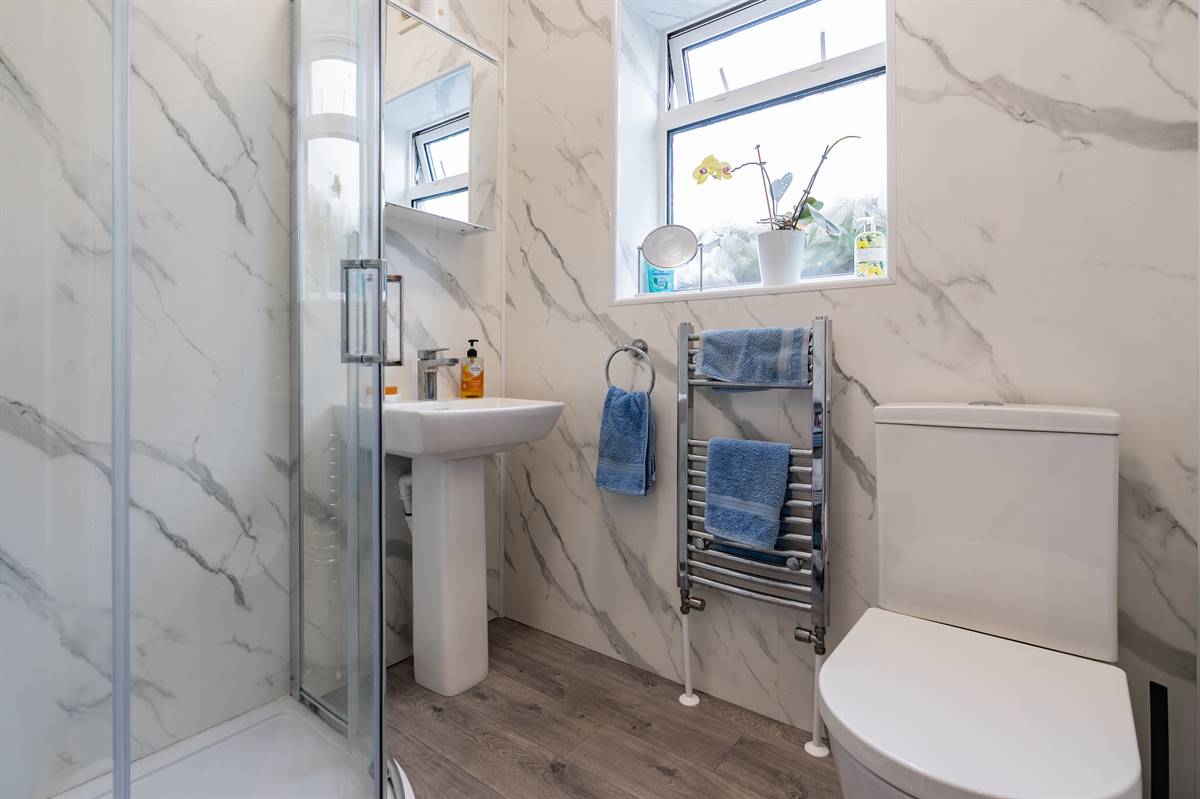 Suite in white comprising fully panelled shower cubicle, pedestal wash hand basin and close coupled WC. Chrome heated towel rail. Panelled walls. Frosted window to side. Laminate flooring.
