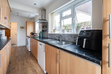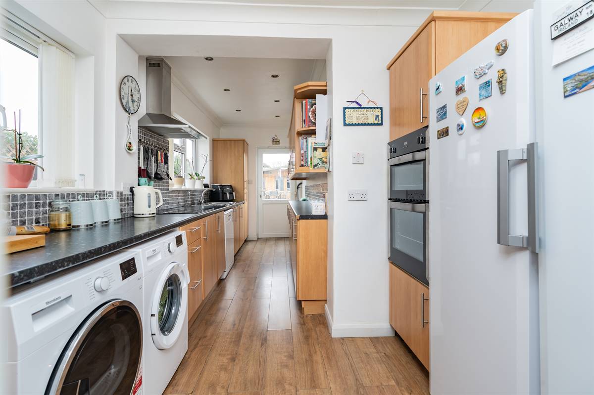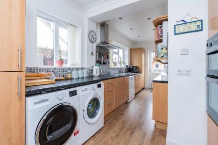 The kitchen is planned with a matching range of wall and base units arranged on two walls. Inset stainless steel 1.5 bowl sink unit. Partially tiled walls. Inset induction hob with stainless steel extractor cooker hood above and built-in fan assisted double oven. Plumbing for washing machine and dishwasher. Wall mounted combination gas boiler supplying hot water and central heating. Window to side and rear. Laminate flooring. Door providing access to rear garden.