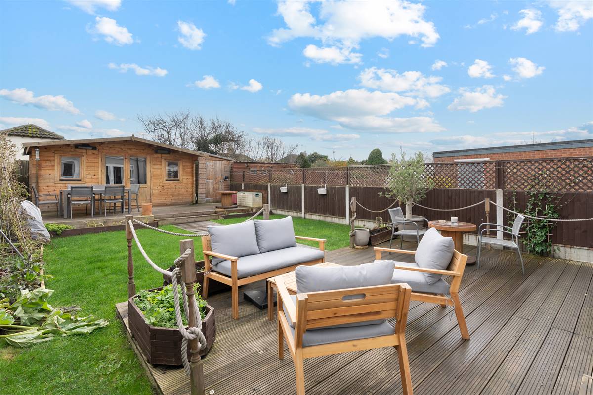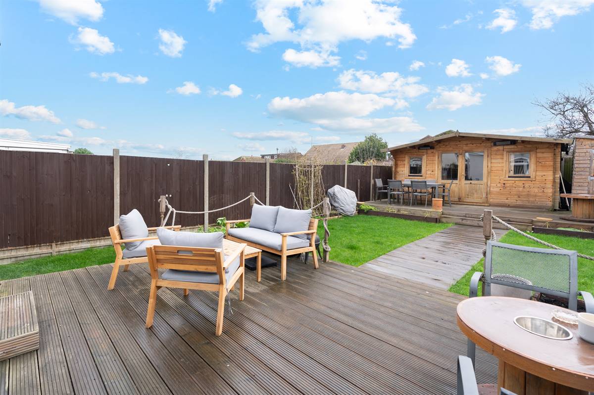 Mainly laid to lawn with flower beds, bushes and shrubs. Two decked seating areas. Summerhouse. Gated pedestrian side access. Enclosed with fencing.