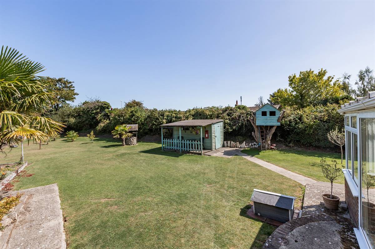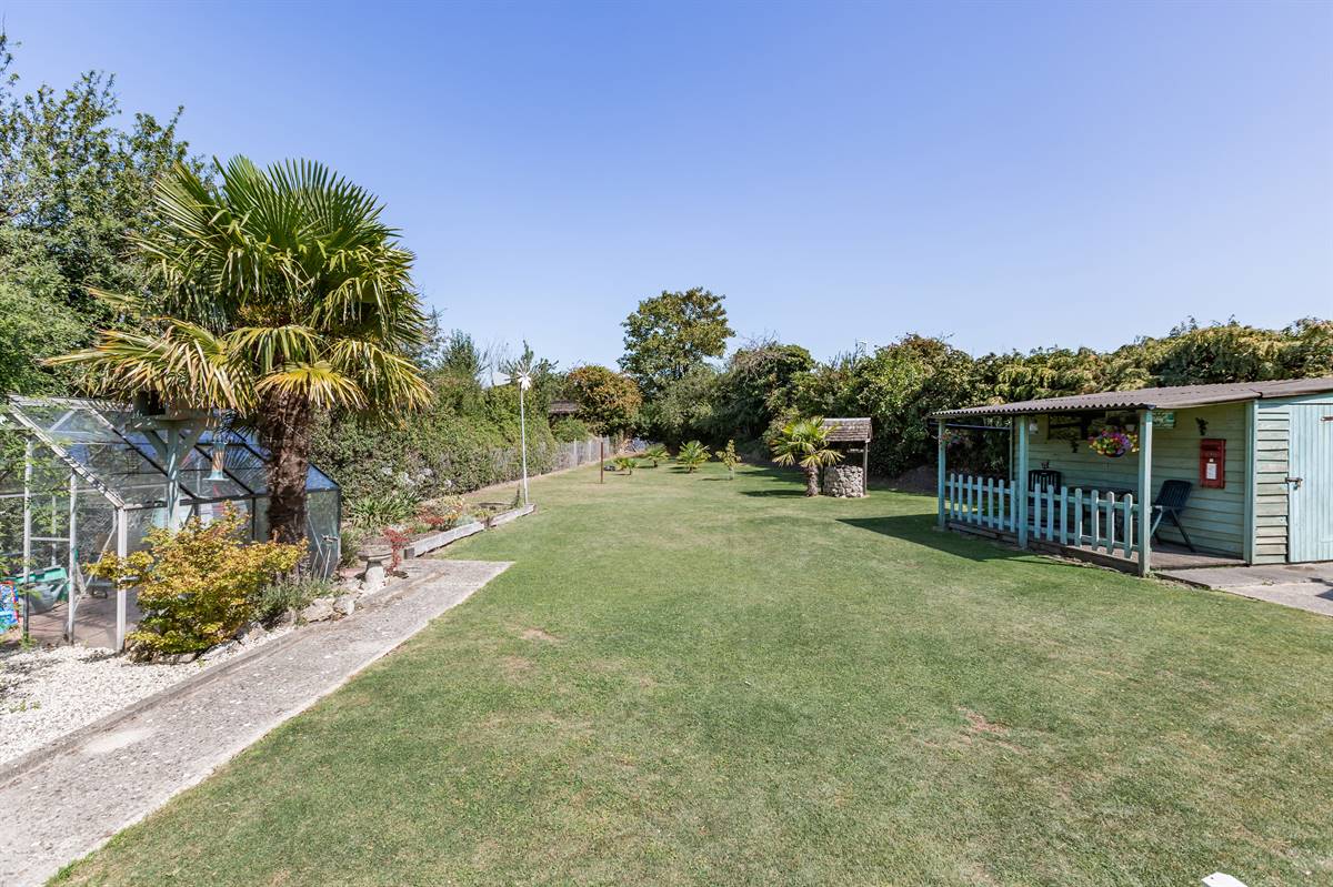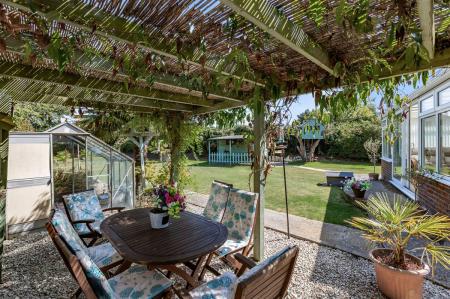 Mainly laid to lawn with flower beds, bushes and shrubs. Concrete patio area. Decked seating area. Greenhouse. Timber shed. Gated pedestrian side access. Enclosed with fencing and hedging.