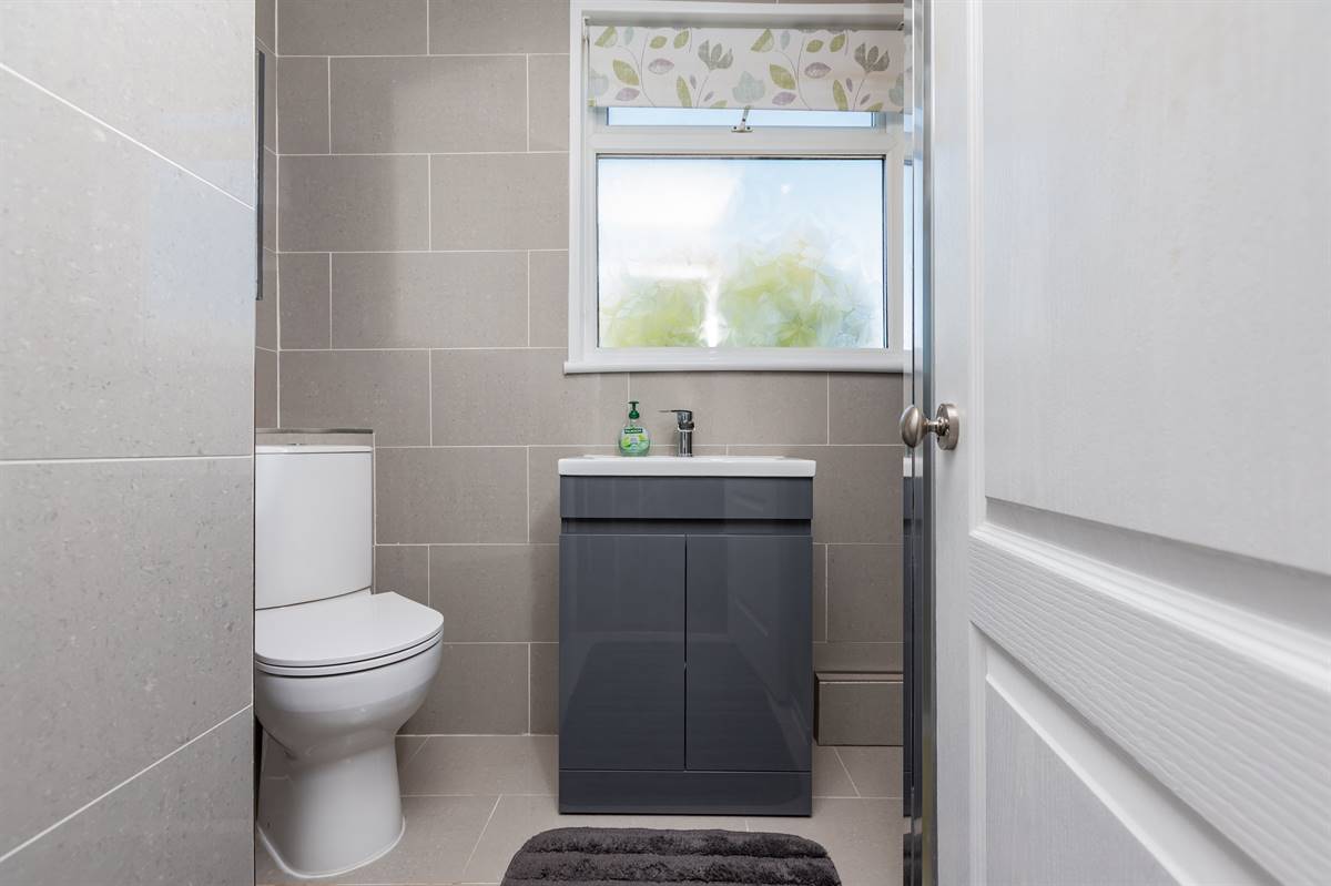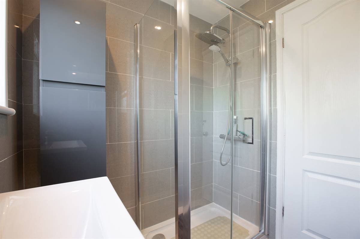 Suite in white comprising fully tiled shower cubicle, wash hand basin set into vanity unit with cupboard below and close coupled WC. Heated towel rail. Tiled walls. Frosted window to rear. Tiled flooring. Extractor fan.