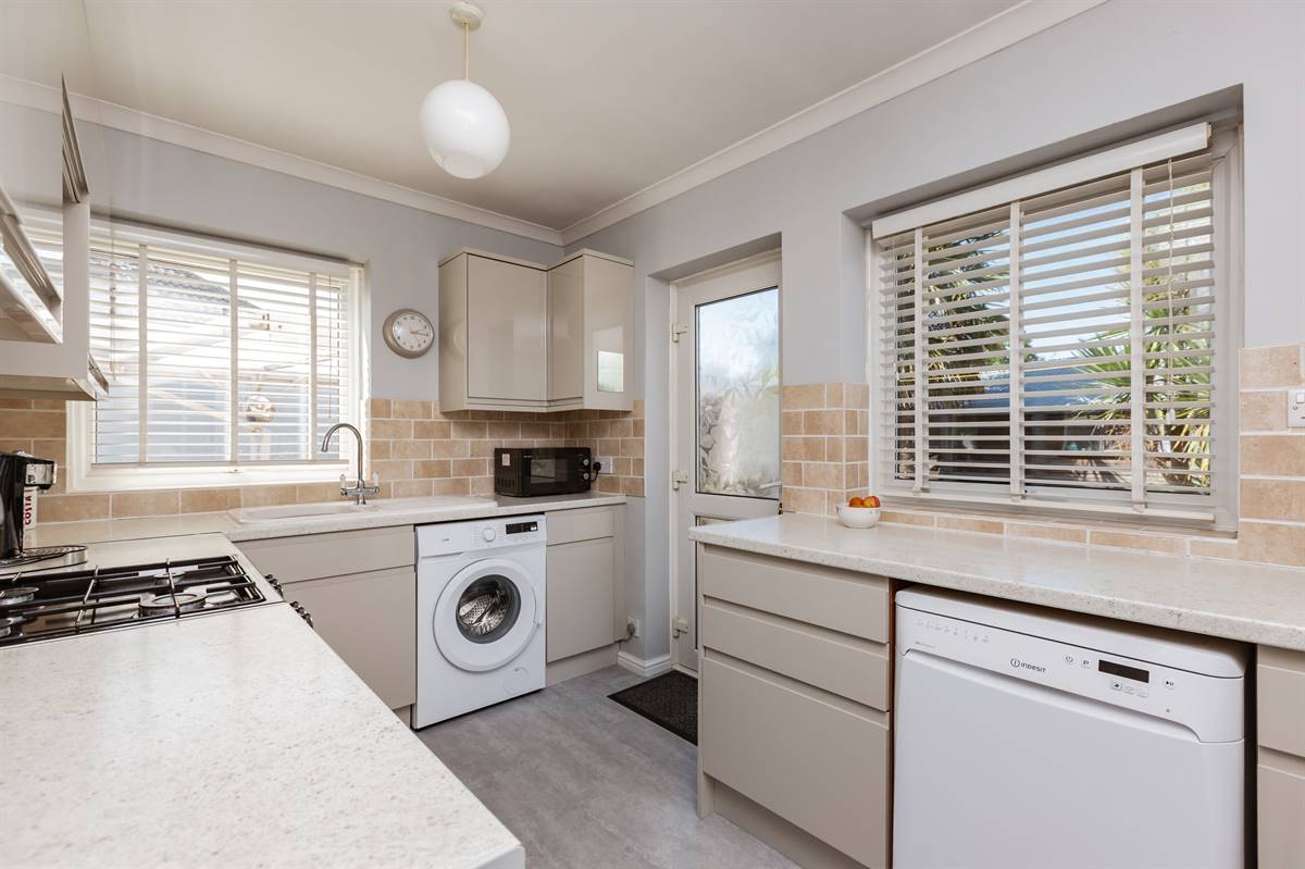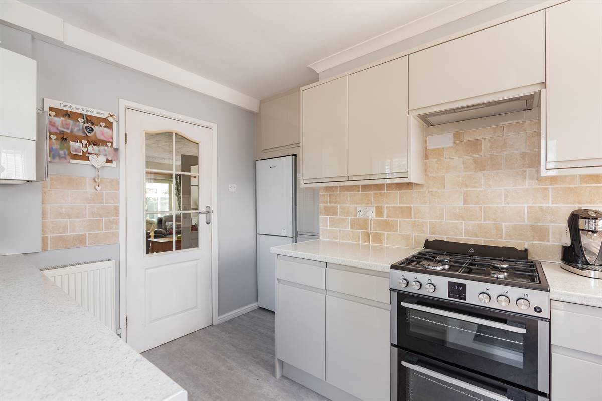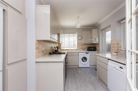 The Kitchen is planned with a matching range of wall and base units arrange on three walls. Inset ceramic sink unit. Partially tiled walls. Gas cooker point. Extractor cooker hood above. Plumbing for washing machine and dishwasher. Wall mounted combination gas boiler supplying hot water and central heating. Window to side and rear. Radiator. Laminate flooring. Door providing access to rear garden.