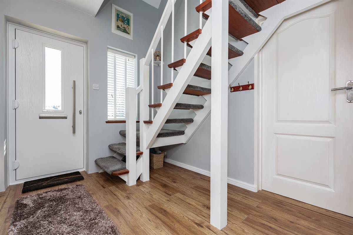 Partially double glazed UPVC front entrance door. Radiator. Stairs leading to first floor. Laminate flooring.