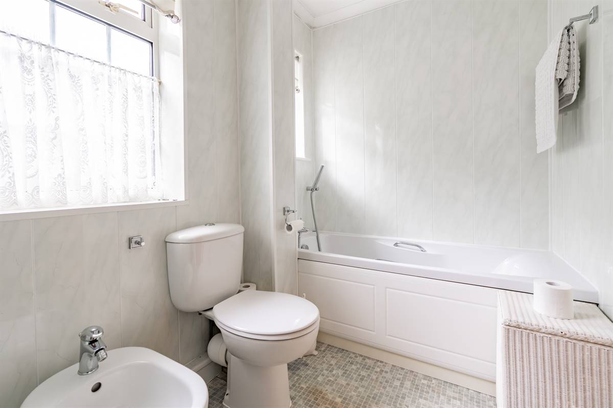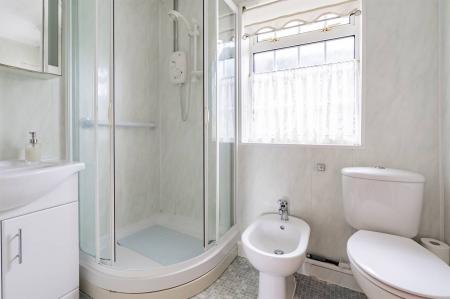 Suite in white comprising panelled bath with mixer tap and hand held shower attachment, separate fully panelled shower cubicle, wash hand basin set into vanity unit with cupboard below and close coupled WC. Bidet. Radiator. Panelled walls. Frosted windows to side. Lino flooring. Extractor fan.