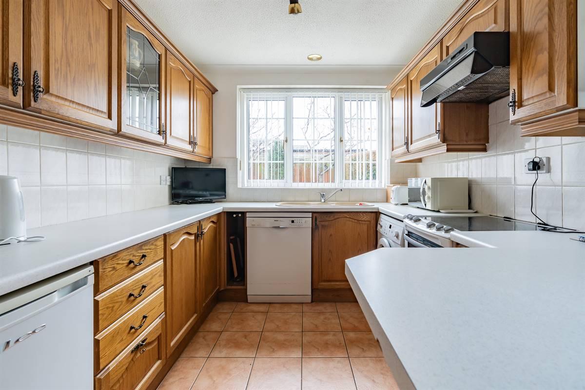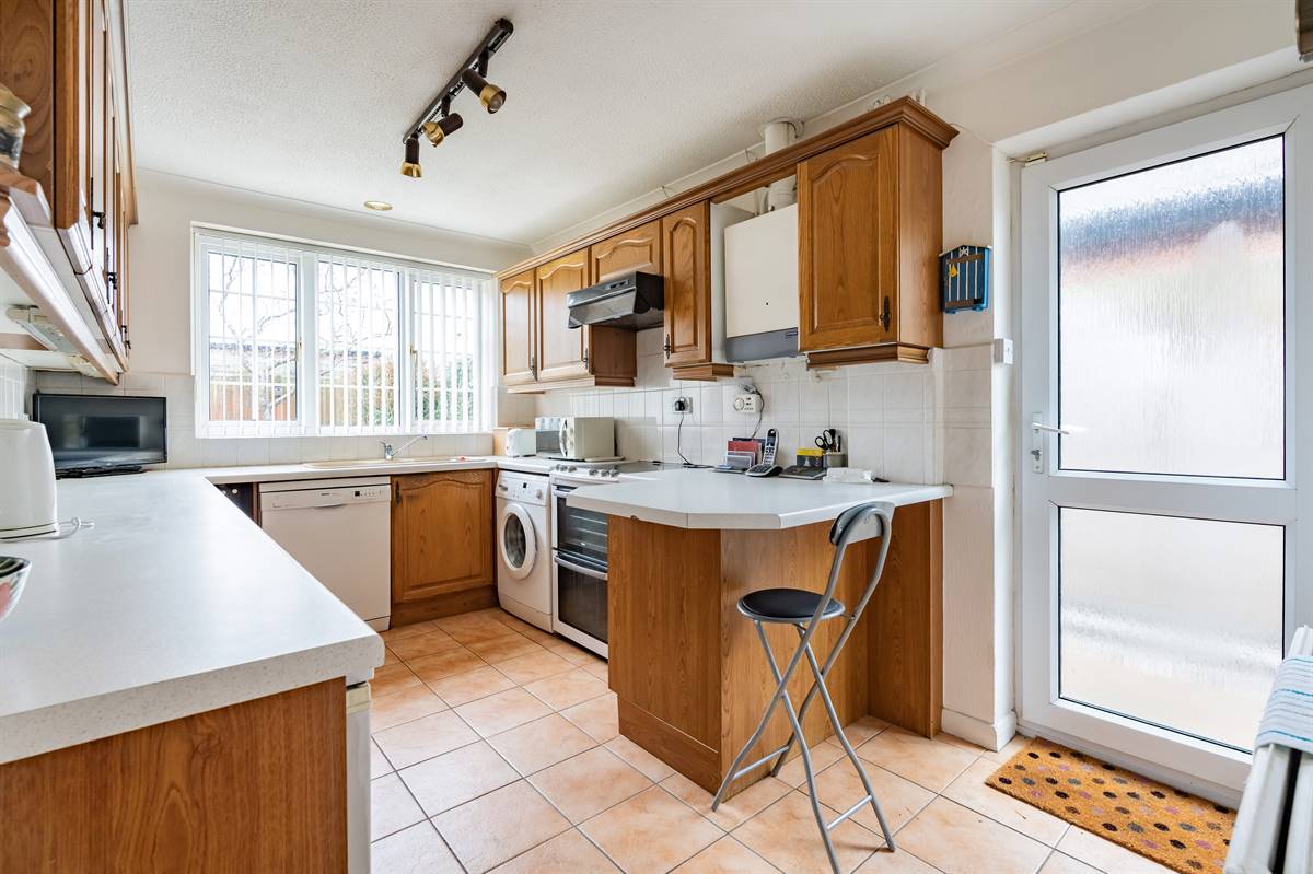 The kitchen is planned with a matching range of wall and base units arranged on three walls. Inset sink unit. Electric cooker point and extractor cooker hood above. Plumbing for washing machine and dishwasher. Wall mounted gas boiler supplying hot water and central heating. Window to rear. Radiator. Tiled flooring. UPVC double glazed door to side.