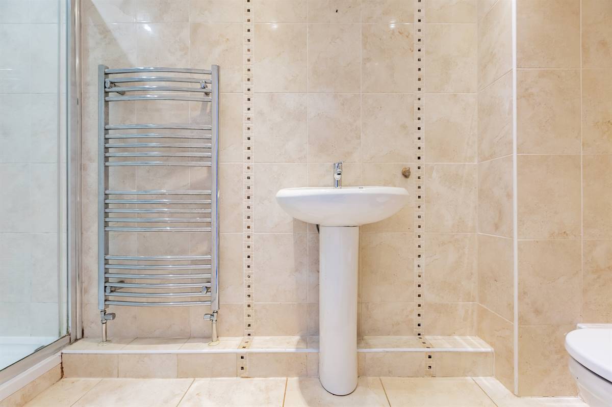 Suite in white comprising separate fully tiled double shower cubicle, pedestal wash hand basin and close coupled WC. Chrome heated towel rail. Tiled walls. Extractor fan. Downlighters. Tiled floor.