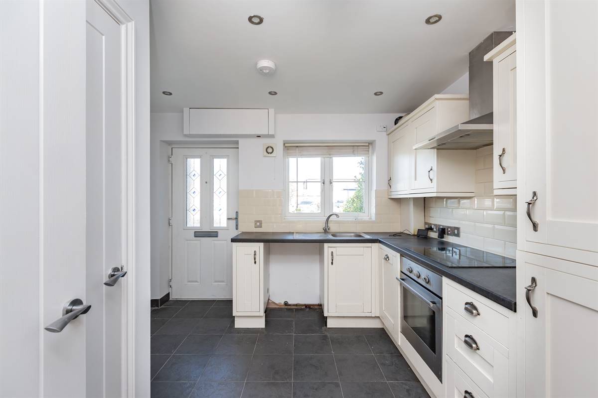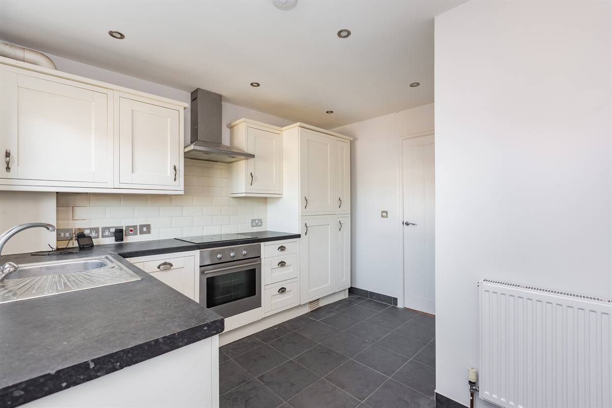 Matching range of wall and base units. Inset single drainer stainless steel sink unit. Work surfaces. Partially tiled walls. Inset ceramic hob with stainless steel extractor cooker hood above and built-in electric oven below. Plumbing for washing machine and dishwasher. Integrated fridge/freezer. Unit housing wall mounted combination gas boiler supplying hot water and central heating. Window to front. Radiator. Downlighters. Tiled floor. Large storage cupboard. Door to inner hall.