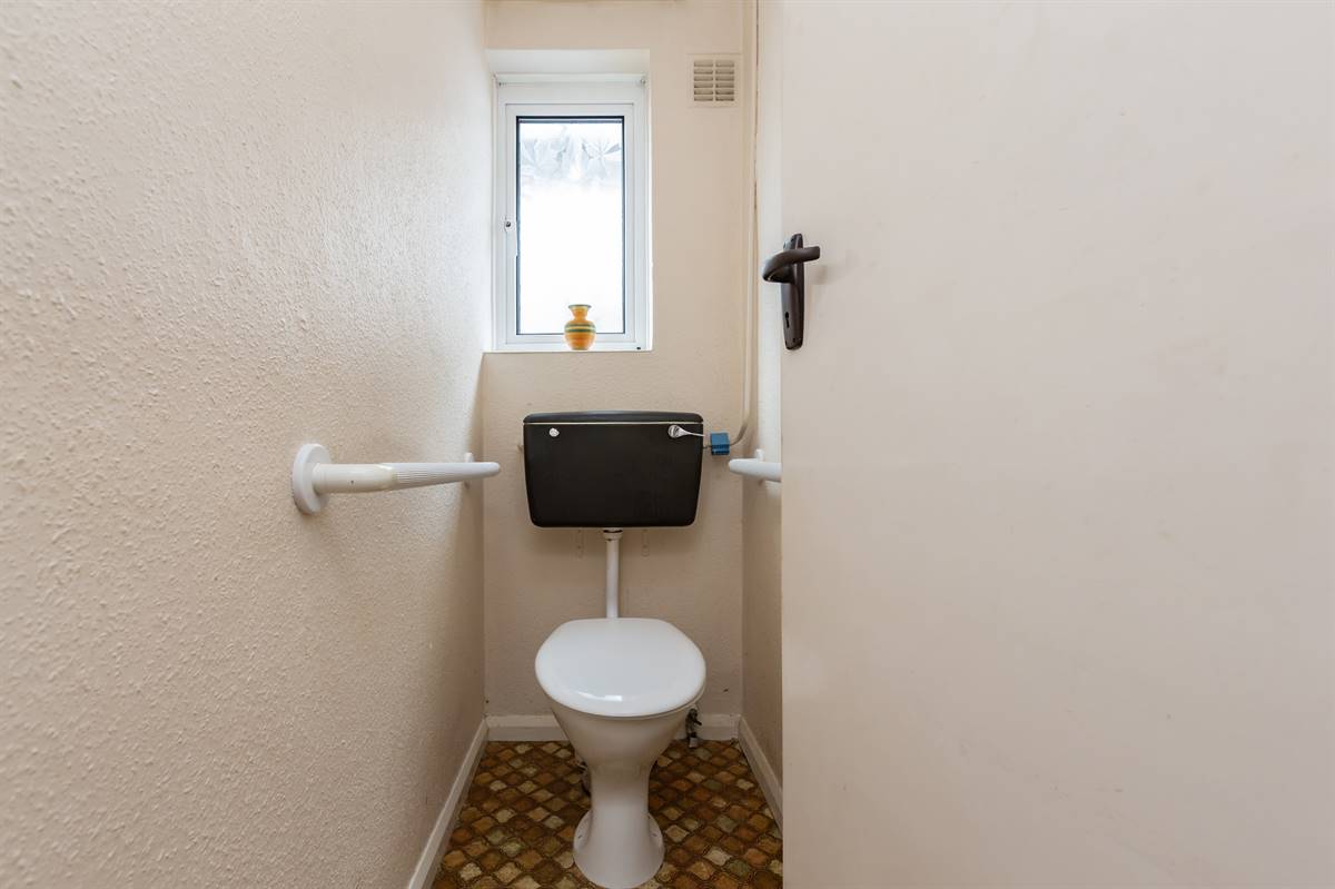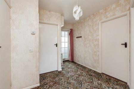 Partially glazed painted wood front entrance door. Radiator. Thermostat control for central heating. Access to loft. Airing cupboard with shelves and housing lagged hot water cylinder fitted with immersion heater.