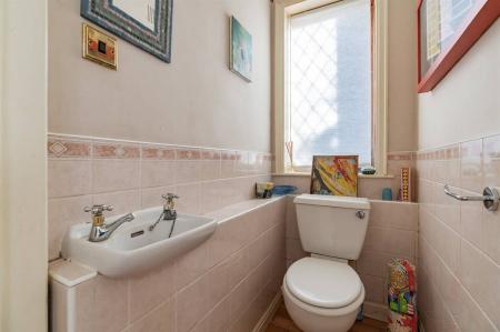 Suite in white comprising wash hand basin and close coupled WC. Partially tiled walls. Frosted window to front. Wood flooring.