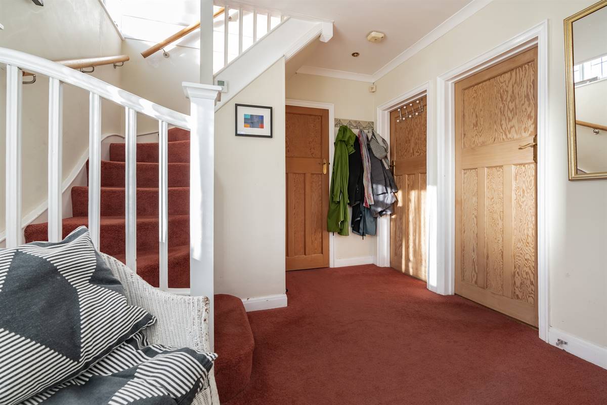 Partially double glazed UPVC front entrance door. Radiator. Stairs leading to first floor.