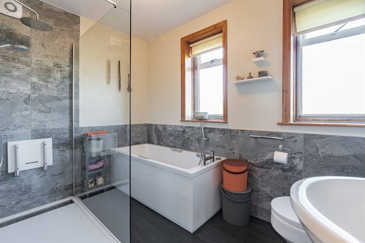 Suite in white comprising panelled bath with mixer tap and separate fully tiled shower cubicle, pedestal wash hand basin and close coupled WC. Chrome heated towel rail. Partially tiled walls. Frosted windows to rear. Laminate flooring. Extractor fan.