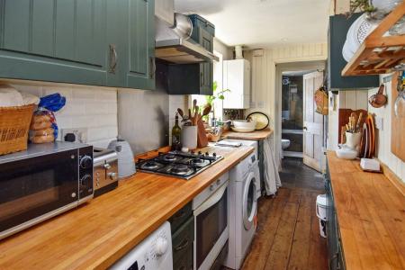 The kitchen is planned with a matching range of wall and base units arranged on two walls. Ceramic butler sink unit. Inset gas hob with stainless steel extractor cooker hood above and built-in fan assisted electric oven below. Plumbing for washing machine and dishwasher. Wall mounted combination gas boiler supplying hot water and central heating. Window to side. Wood flooring. Access to loft area.