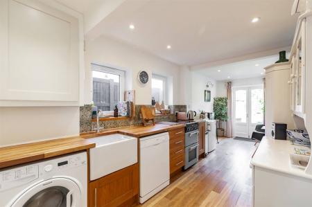 The kitchen is planned with a matching range of wall and base units arranged on one wall. Ceramic butler sink. Partially tiled walls. Dual fuel cooker. Plumbing for washing machine and dishwasher. Wall mounted combination gas boiler supplying hot water and central heating. Two radiators. Windows to side. Wood flooring. French doors providing access to rear garden.