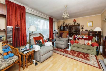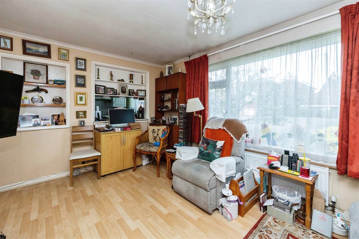 Fireplace housing gas fire with associated back boiler providing hot water and central heating. Large window to front overlooking garden. Double glazed door to front. Radiator. Laminate flooring.