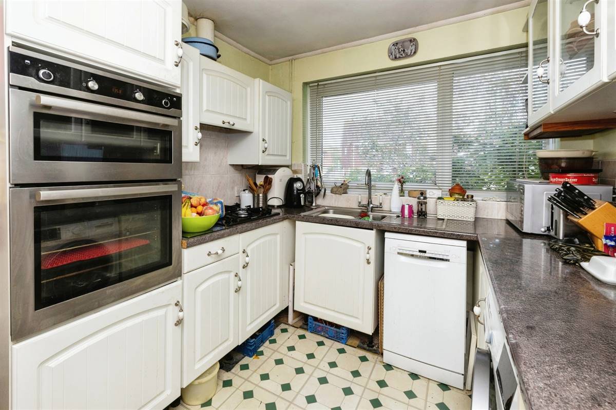 Matching range of wall and base units. Inset single drainer 1.5 bowl sink unit. Work surfaces. Partially tiled walls. Inset gas hob with extractor cooker hood above. Built-in fan assisted electric double oven. Plumbing for washing machine and dishwasher. Window to front overlooking garden. Radiator. Larder cupboard.