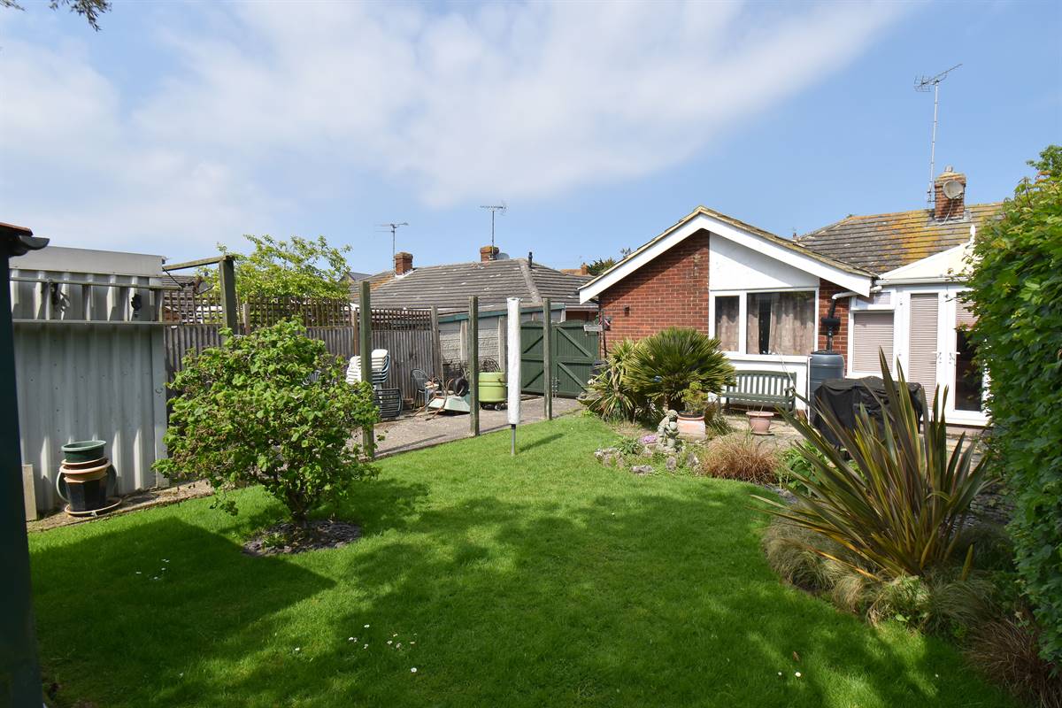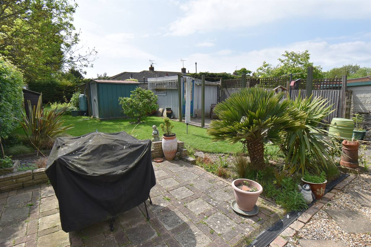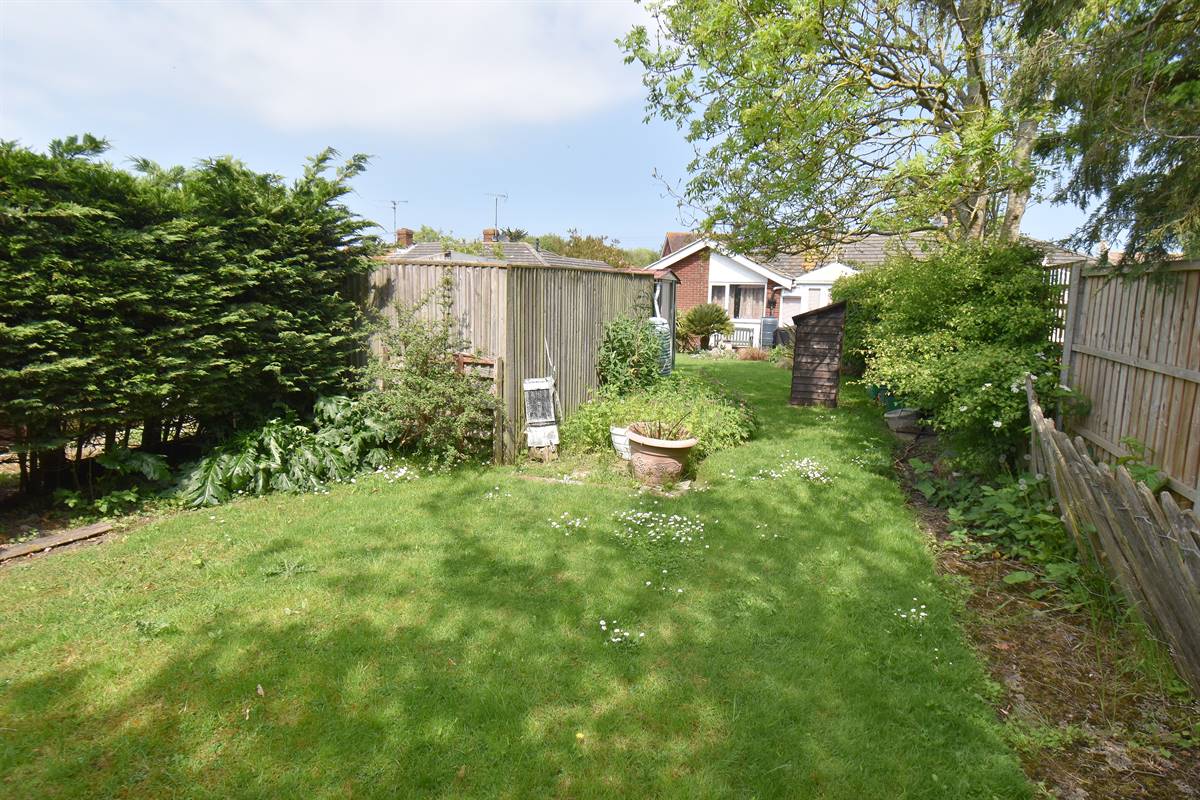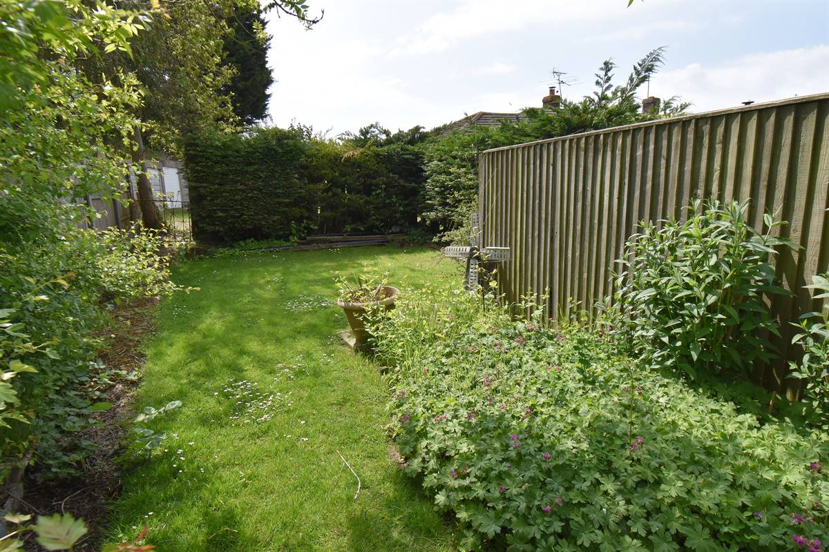 Southerly facing garden mainly laid to lawn with flower beds, bushes and shrubs. Paved patio area. Two sheds. Gated vehicle side access. Enclosed with fencing and hedging.