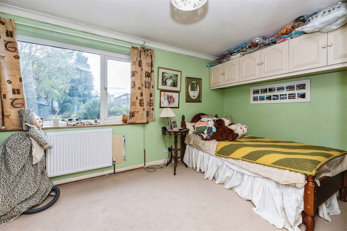 Painted wood front entrance door. Radiator. Cloaks cupboard. Thermostat control for central heating. Access via loft ladder to insulated and partly boarded loft with light. Airing cupboard with shelves and housing lagged hot water cylinder and immersion heater.