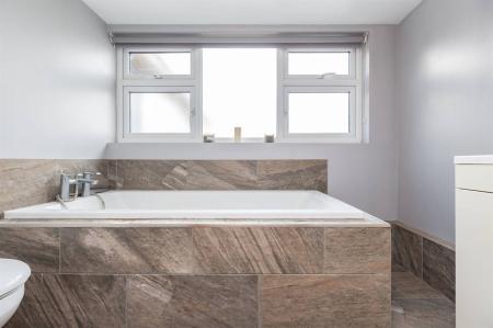 Suite in white comprising panelled bath with mixer tap and hand held shower attachment, pedestal wash hand basin set into vanity unit with cupboard below and WC with concealed cistern. Partially tiled walls. Frosted window to front. Tiled flooring.
