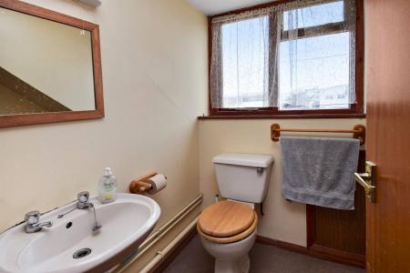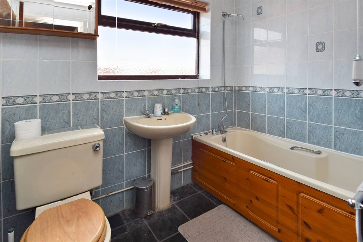 Suite comprising panelled bath with mixer tap and shower attachment, pedestal wash hand basin and close coupled WC. Radiator. Tiled walls. Frosted window to side. Laminate flooring.