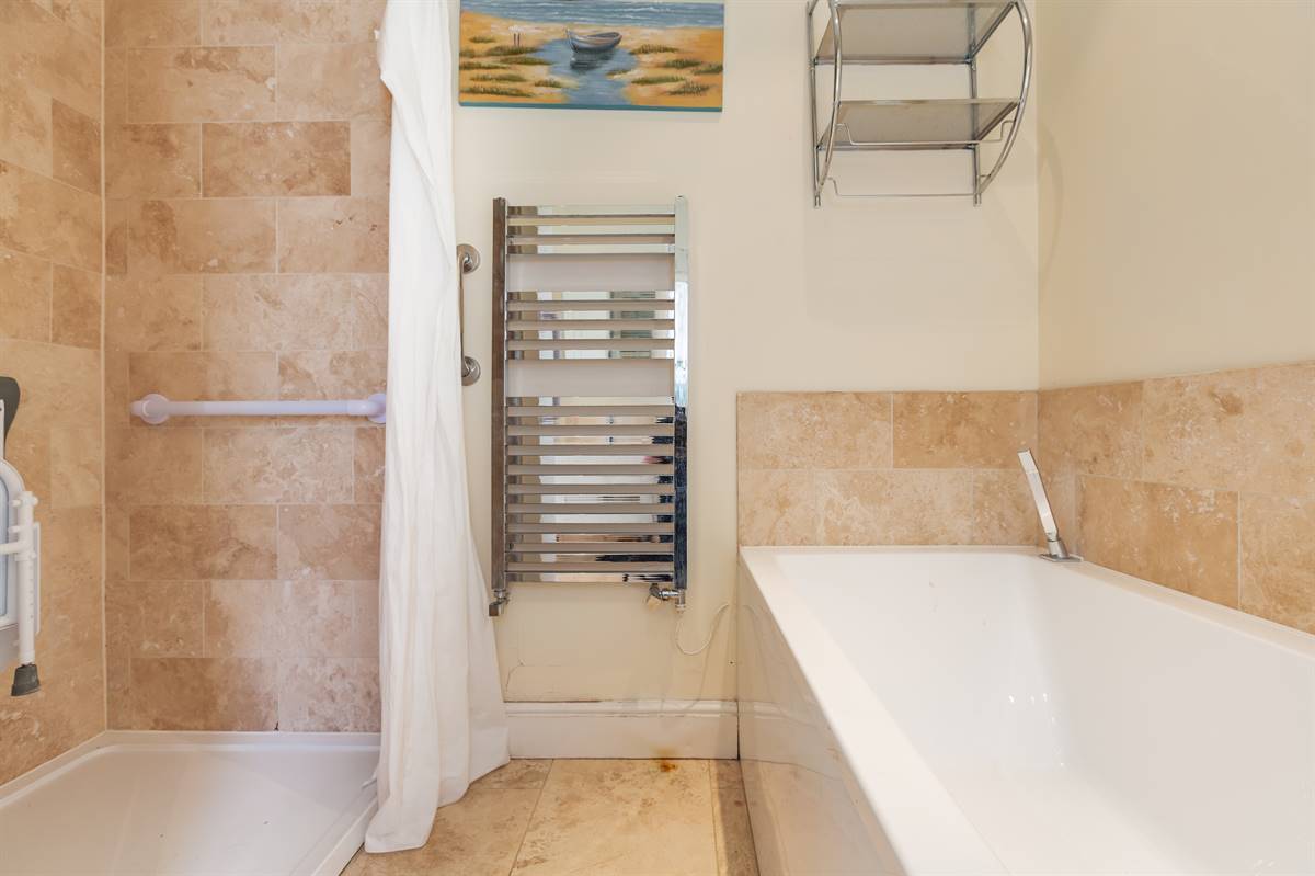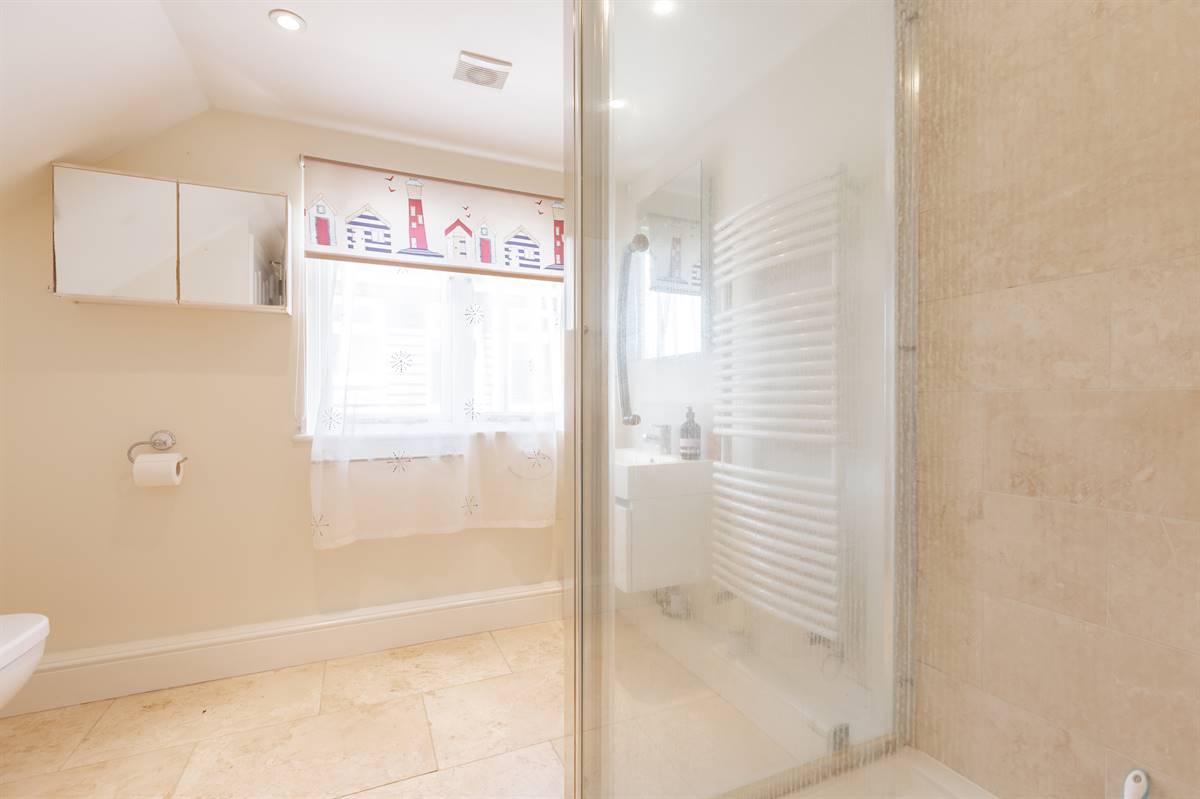 Suite in white comprising of panelled bath with mixer tap and hand held shower attachment. Separate fully tiled shower cubicle. Wall hung wash hand basin set into vanity unit with drawers below. Close coupled WC. Chrome heated towel rail. Partially tiled walls. Frosted window to side. Tiled flooring. Extractor fan.