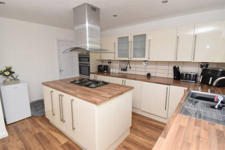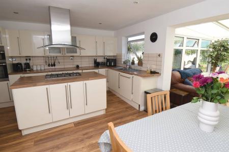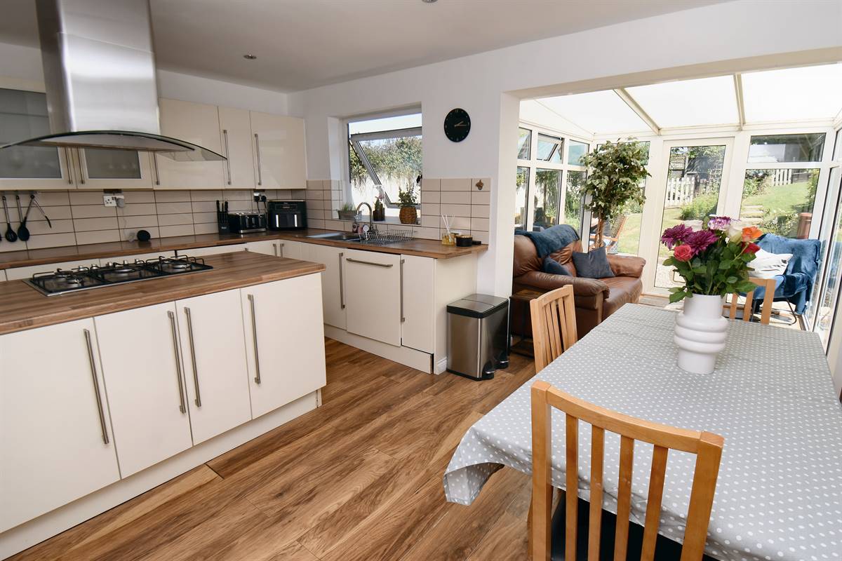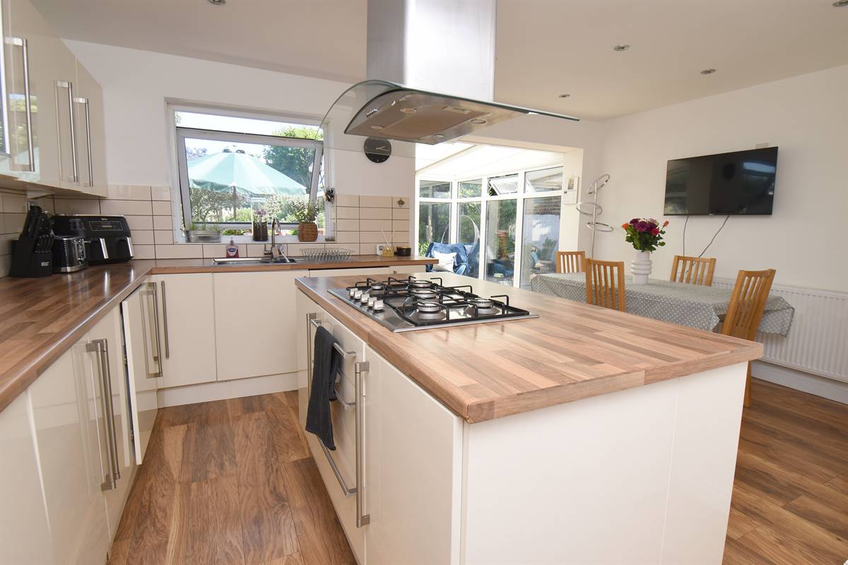 Matching range of wall and base units. Inset single drainer stainless steel 1 ½ bowl sink unit. Work surfaces. Partially tiled walls. Island unit housing inset five ring gas hob with stainless steel extractor cooker hood above and cupboards and drawers below. Built-in fan assisted electric double oven. Integrated dishwasher and washing machine. Cupboard housing wall mounted combination Valliant gas boiler supplying hot water and central heating. Window to rear overlooking garden. Radiator. Downlighters. Laminate flooring. Thermostat control for central heating. Opening to conservatory.