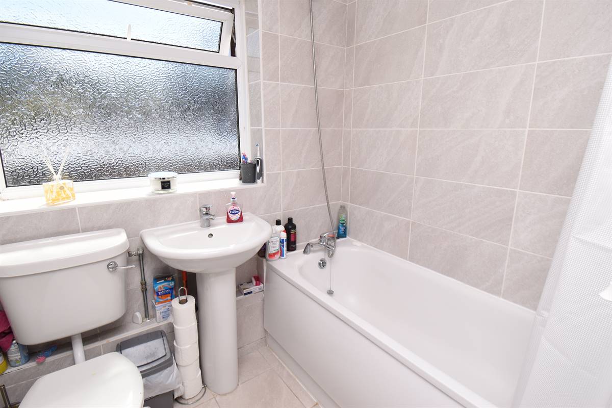 Suite in white comprising panelled bath with mixer tap and shower attachment, pedestal wash hand basin and low level WC. Chrome heated towel rail. Tiled walls. Frosted window to side. Downlighters. Tiled floor.