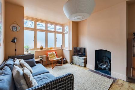 Fireplace with open hearth. Bay window to front. Radiator. Wood flooring.