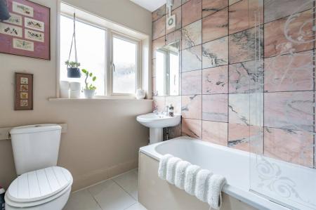 Suite in white comprising panelled bath with mixer tap and separate shower unit over bath with screen to side, pedestal wash hand basin and close coupled WC. Radiator. Partially tiled walls. Frosted window to rear. Tiled flooring. Extractor fan.