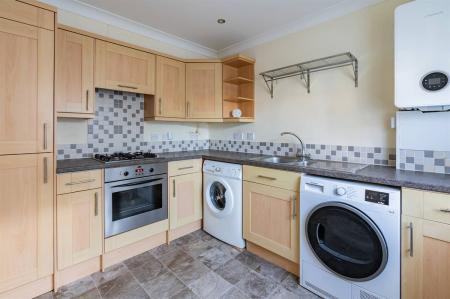 The kitchen is planned with a matching range of wall and base units arranged on two walls. Stainless steel 1.5 bowl sink unit. Partially tiled walls. Inset gas hob with extractor cooker hood above and built-in fan assisted electric oven below. Plumbing for washing machine, fridge and freezer. Wall mounted combination gas boiler supplying hot water and central heating. Window to front. Radiator. Lino flooring.