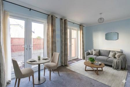 Inside, the home features two generous double bedrooms, a bright and welcoming lounge with French doors opening directly onto the rear garden, a fitted kitchen/breakfast room and sleek, modern wet room. The layout provides an easy flow and a sense of light throughout.