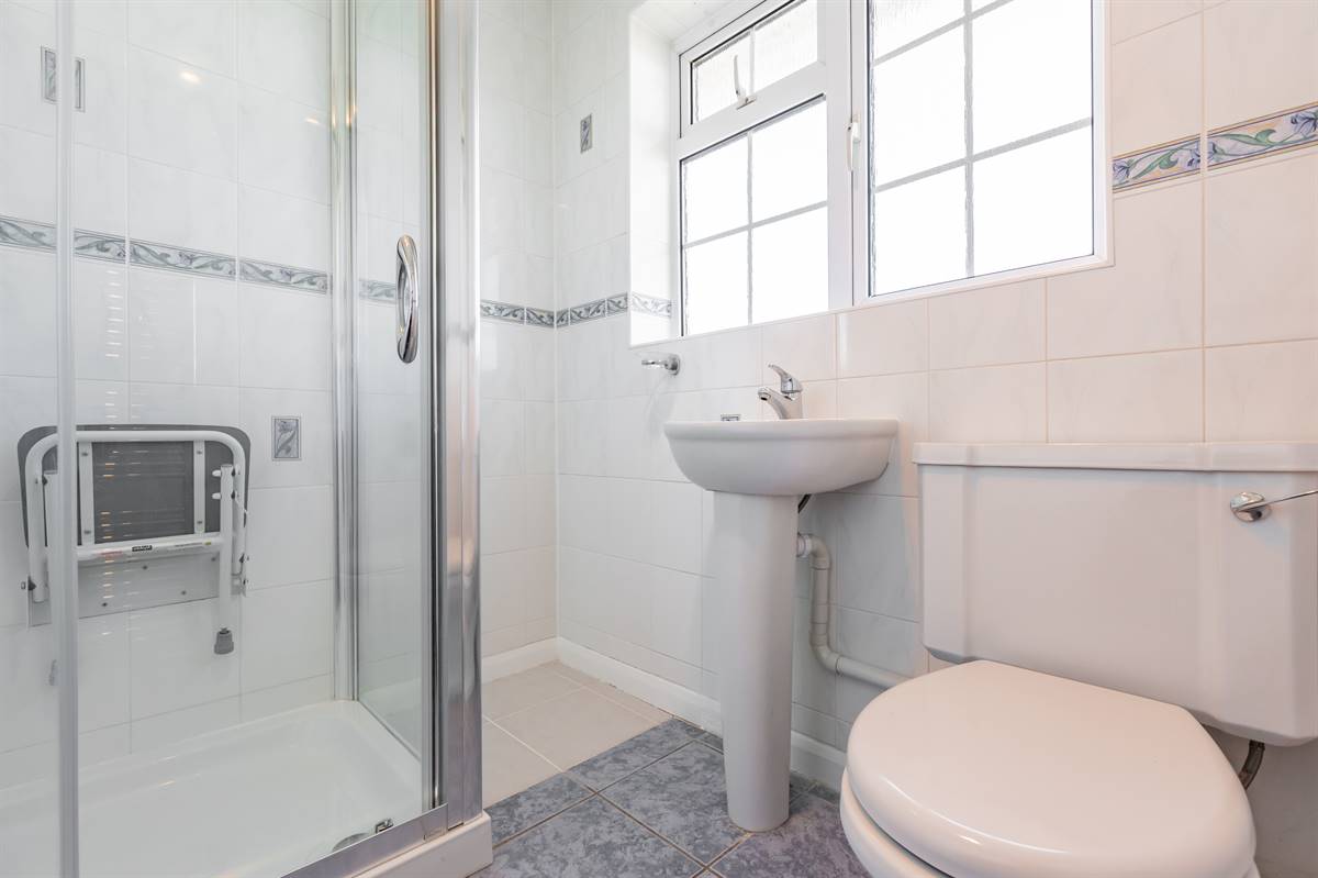 Suite in white comprising fully tiled shower cubicle, pedestal wash hand basin and close coupled WC. Chrome heated towel rail. Tiled walls. Frosted window to rear. Chrome heated towel rail.