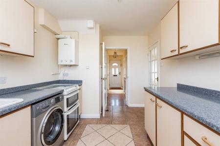 Range of wall and base units. Inset single drainer 1.5 bowl sink unit. Work surfaces. Partially tiled walls. Electric and gas cooker points. Plumbing for washing machine. Wall mounted Worcester gas boiler supplying hot water and central heating. 2 windows to rear overlooking garden. Tiled floor. Understairs cupboard. Door providing access to rear garden.