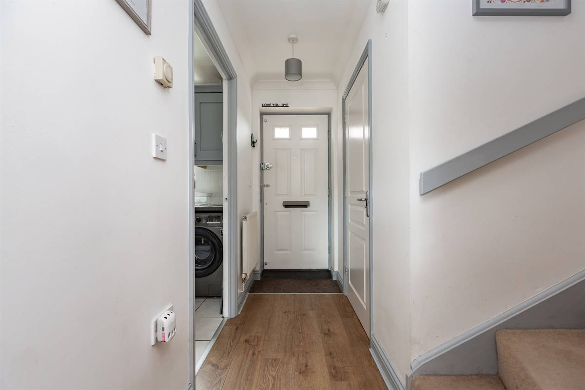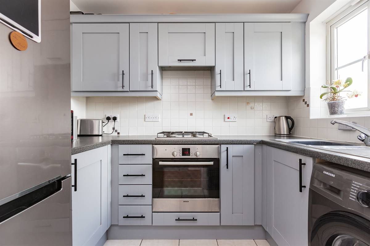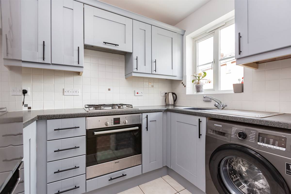 The kitchen is planned with a matching range of wall and base units arranged on three walls. Inset hob with stainless steel extractor cooker hood above and built-in gas fan assisted electric oven below. Plumbing for washing machine. Wall mounted gas boiler supplying hot water and central heating. Window to front. Tiled flooring.