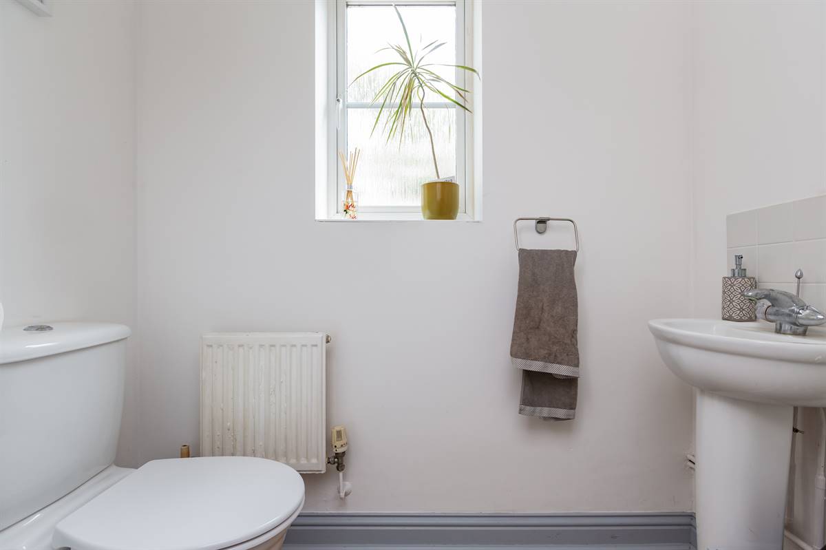 Suite in white comprising pedestal wash hand basin and close coupled WC. Radiator. Frosted window to side. Laminate flooring.