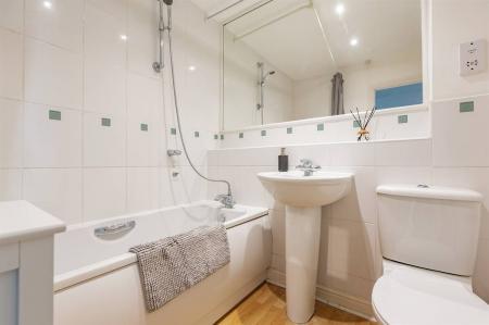 Suite in white comprising panelled bath with mixer tap and shower attachment, pedestal wash hand basin and close coupled WC. Radiator. Partially tiled walls. Laminate flooring.