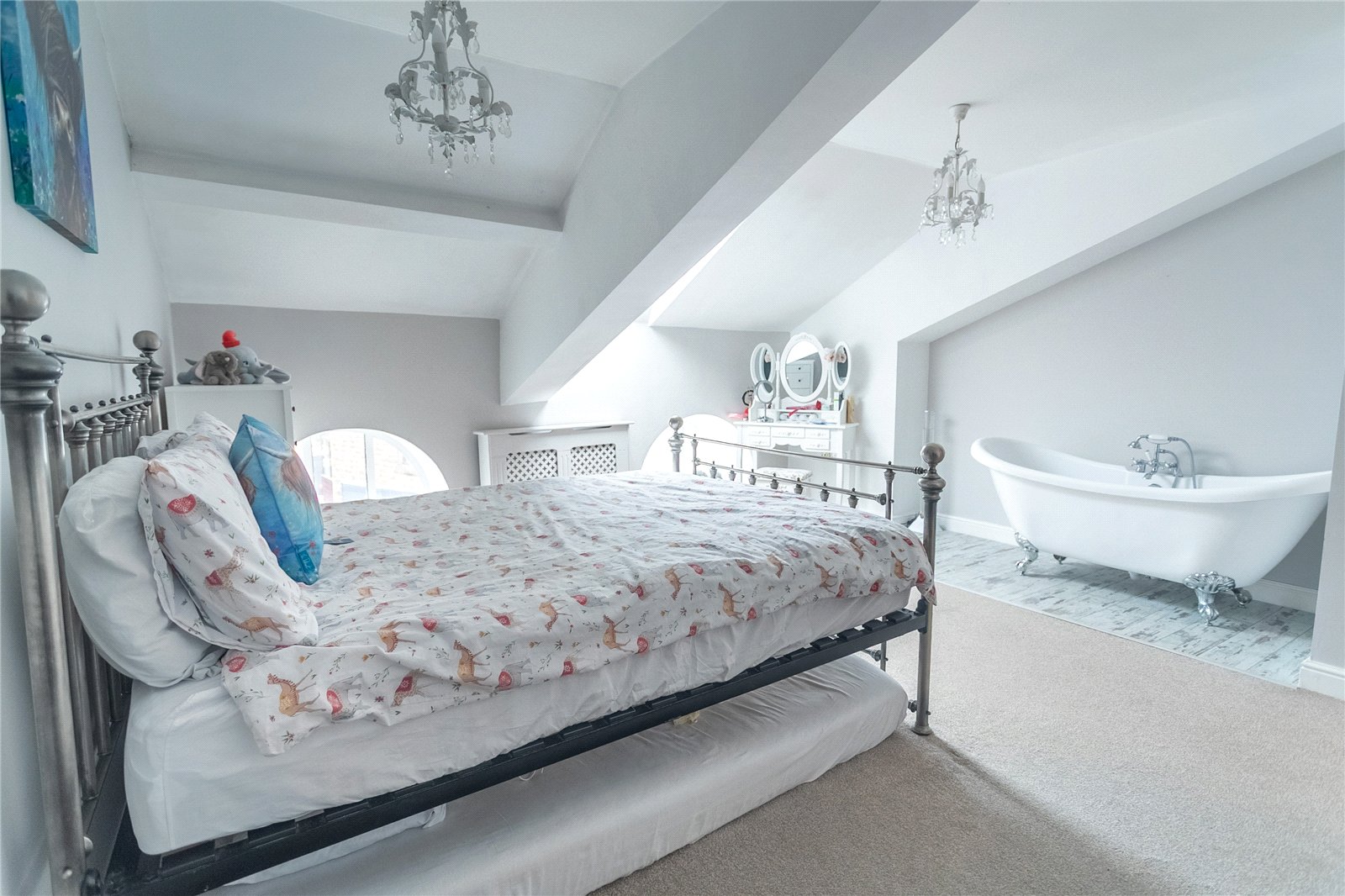 Internally the accommodation covers approximately 1040sqft of living space over THREE LEVELS and boasts QUALITY FIXTURES AND FITTINGS installed throughout, comprising of entrance hall, lounge, MODERN FITTED KITCHEN with patio doors leading to garden. To the first floor, two bedrooms and a DELUXE FAMILY SHOWER ROOM, before leading to the second floor master bedroom with FREE STANDING BATH and w.c. There is also a loft space with carpet flooring.